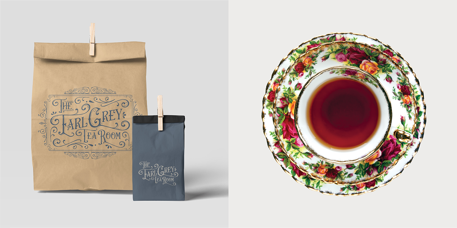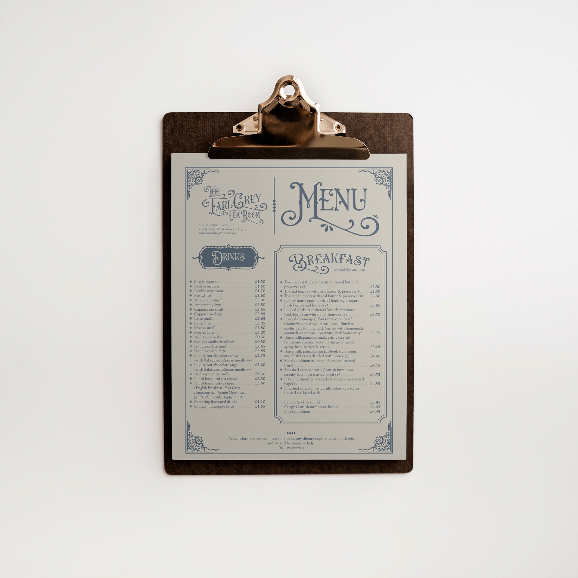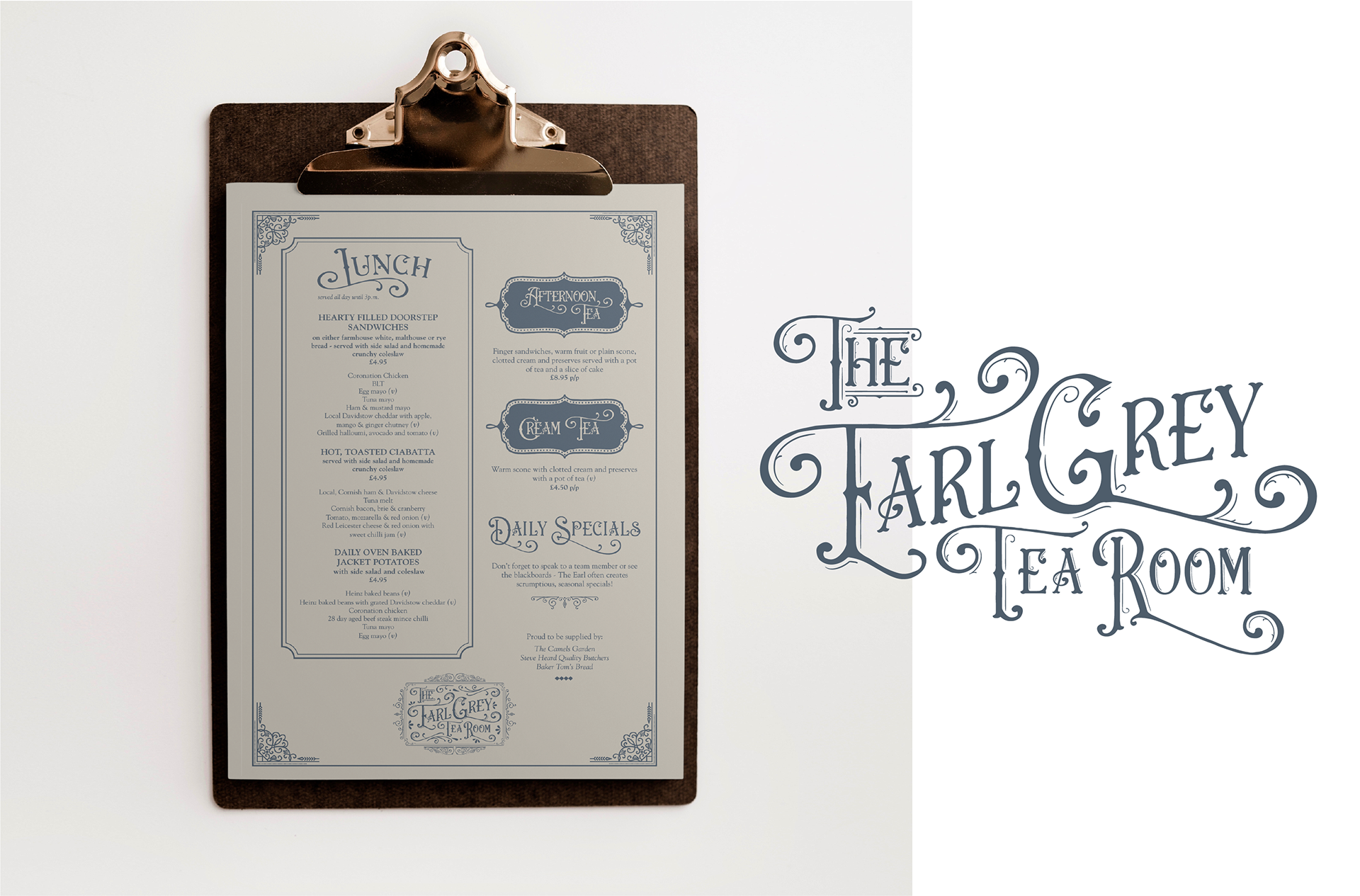 Logo and menu design for The Earl Grey Tea Room in Camelford, Cornwall.